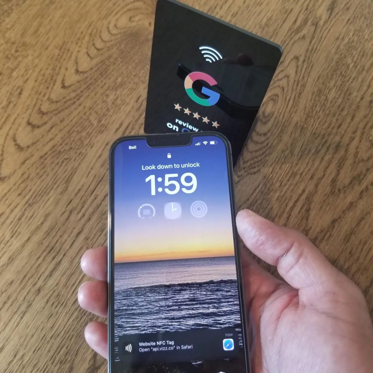 The NFC Stand (card, sticker or coaster) has an in-built NFC chip which responds to the in-built NFC in your device. When you ‘tap’ your phone to the stand, the stand sends a link to your device. Your customer can click on the link and leave a review for your business in seconds.